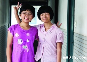 调皮的宋文清(右)在她的小伙伴王少云头上摆V字造型