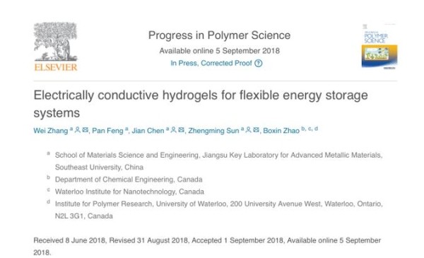 材料科学与工程学院章炜副教授(共同通讯作者)、冯攀博士、陈坚教授(共同通讯作者)、孙正明教授(共同通讯作者)与加拿大滑铁卢大学赵博欣教授合作在“Progress in Polymer Science”上发表了题为“Electrically conductive hydrogels for flexible energy storage systems”的综述论文,该综述以伟德体育官网材料科学与工程学院为唯一通讯单位。“Progress in Polymer Science”主要介绍全世界高分子研究中的前沿及热点领域,每年仅出版综述文章43篇。2017年该期刊影响因子为24.558,属于高分子领域最有影响力的学术刊物之一。