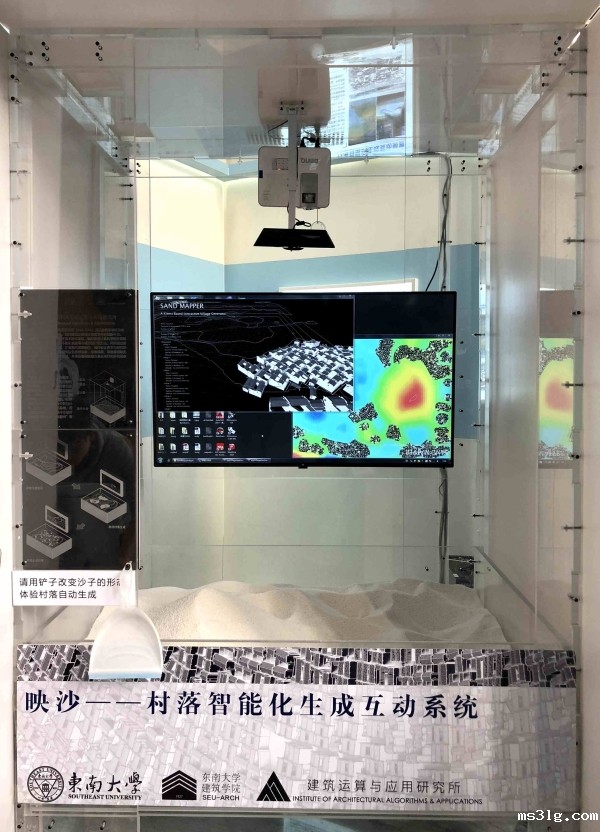 “映沙”是一个以沙子为载体,以村落自组织程序生成为主题的互动装置。沙子可由参与者任意调整堆积形状,以此模拟自然地形。该装置可根据地形、容积率、功能设定等数据要求,自动进行预设区域内的地块划分,道路生成和建筑群的生成设计,为城市与乡村的更新提供智能化的优化方案,快速整合数据并据此提供综合优化的原始方案,升级版的生成工具可以支持方案的循环优化和建筑群的深度细化。可广泛运用于山地村落灾后重建,传统建筑聚落空间的更新织补,乃至一般性城市地块的更新改造和城市设计。该装置综合了伟德体育官网建筑学院建筑运算与应用研究所在本科四年级开设的住区生成设计,本科五年级毕业设计以及研究生教学的成果。与其他展品不同的是,映沙互动装置从软件到硬件都由学生们自己设计研发并加工制作,是建筑设计、规划设计与信息技术的结合的新工科建设成果。