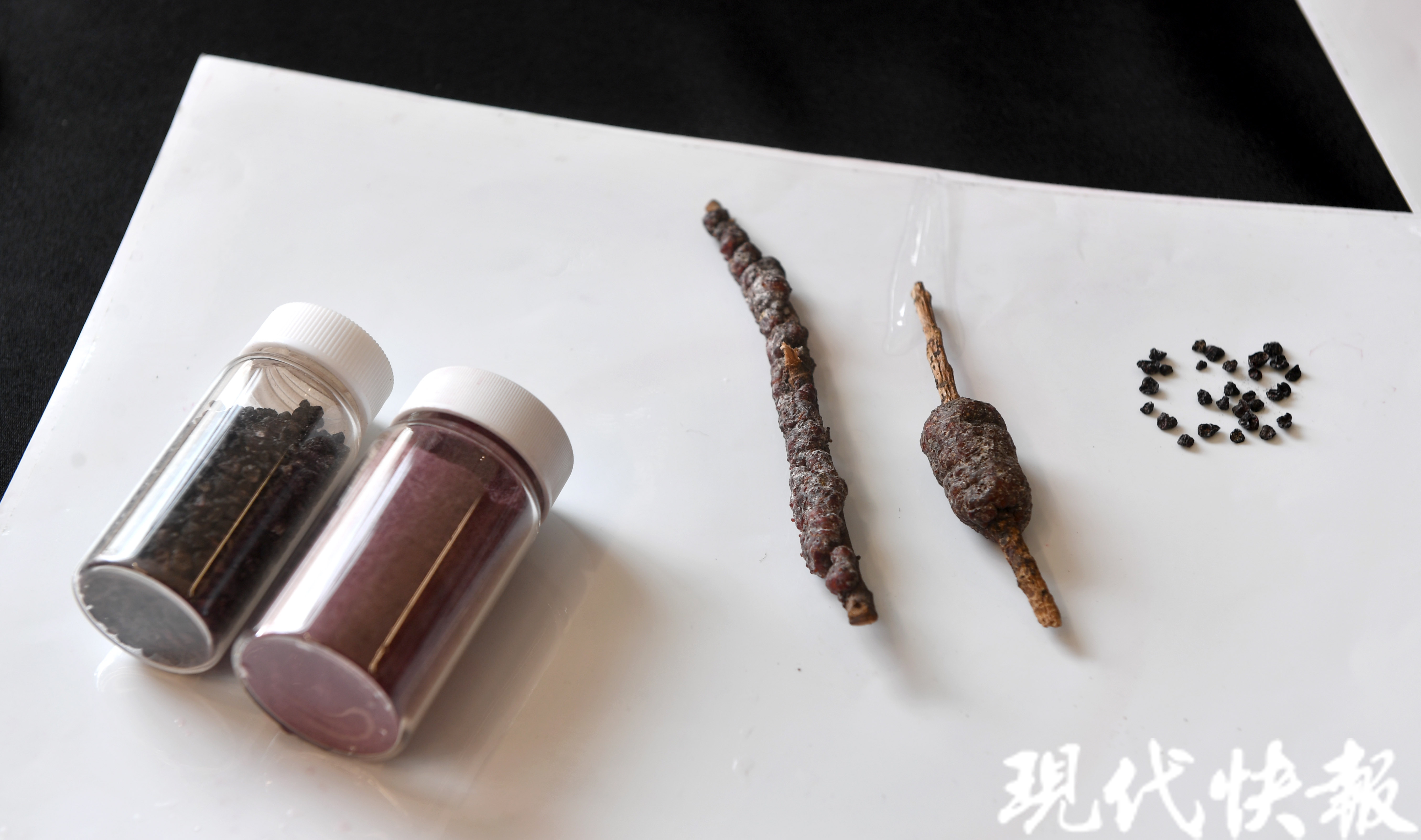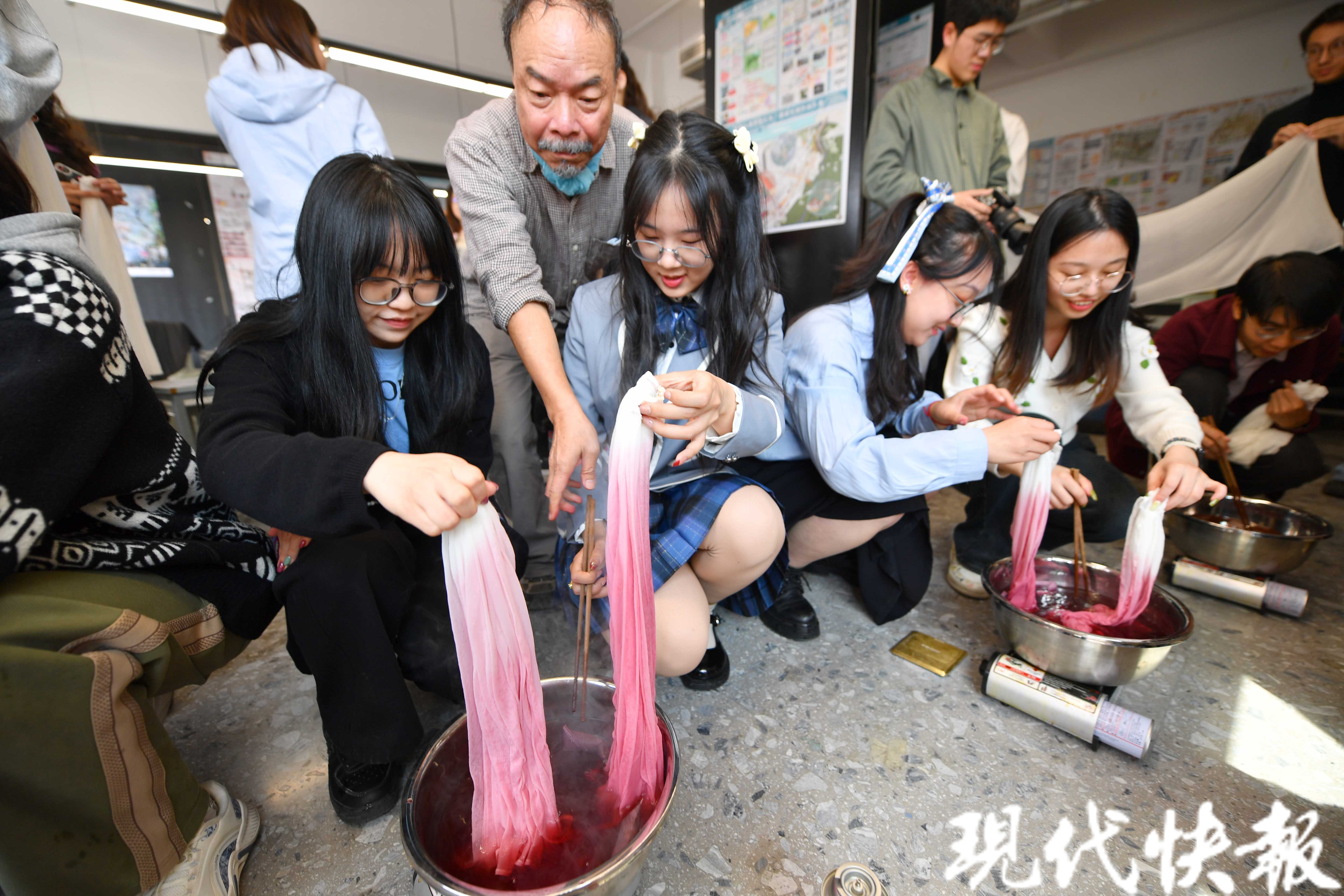 “在南方很常见的荔枝树和龙眼树上有一种寄生虫名为紫胶虫,一千多年前,隋唐人就是用这种虫子提炼出了胭脂红……”课堂上,曾启雄向同学们介绍中国传统色彩的历史典故及传统制作工艺,讲解天然染料紫胶虫、胭脂虫的由来。