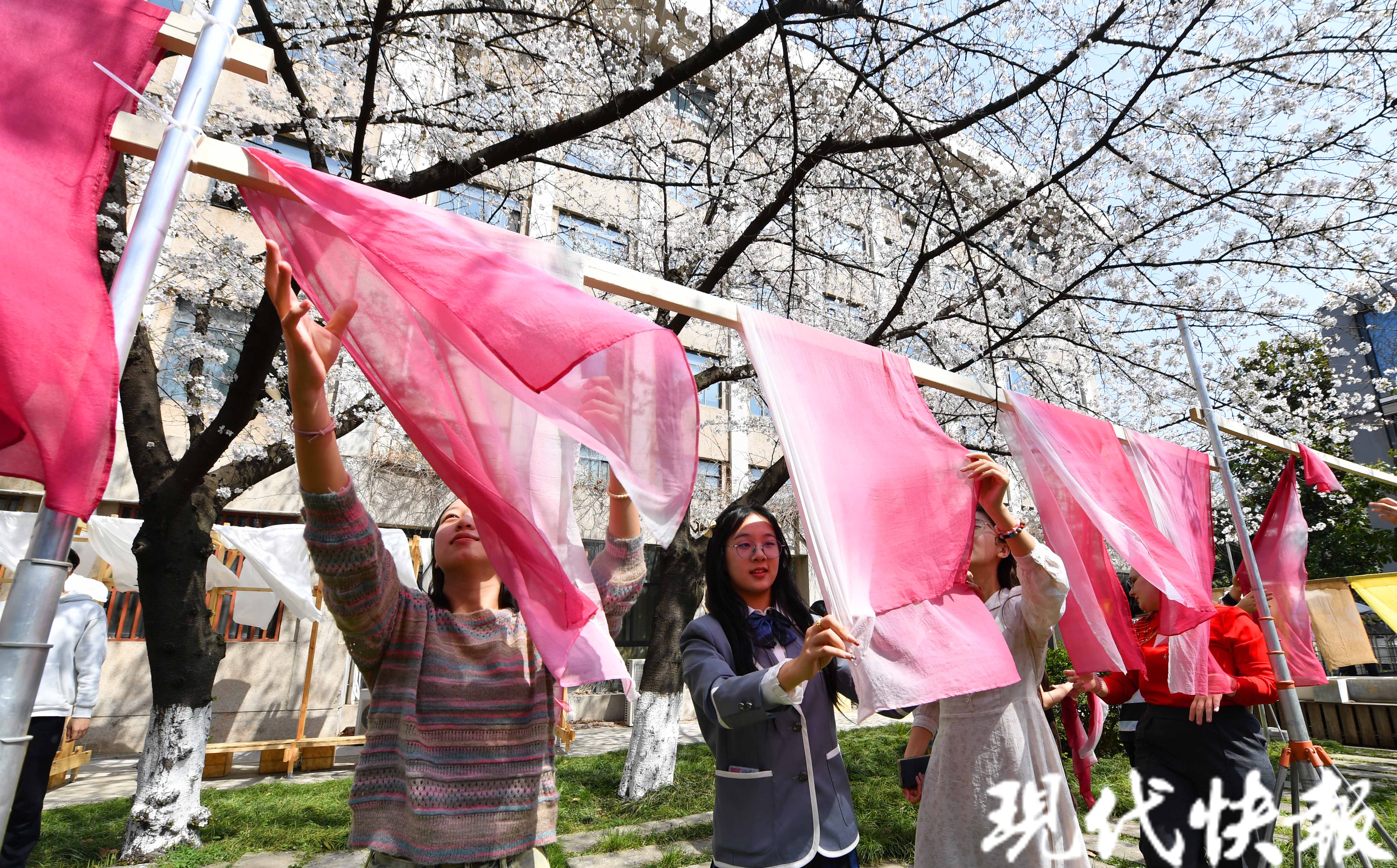 染制好的一条条丝巾,被同学们亲手系在樱花树下的艺术展架上,宛若复刻了樱花烂漫的春天。春风拂来,展架上片片樱花吹落如雨、缕缕丝巾随风舒展,同学们纷纷举起手机,记录下BETVLCTOR伟德在线校园里的美妙时刻。